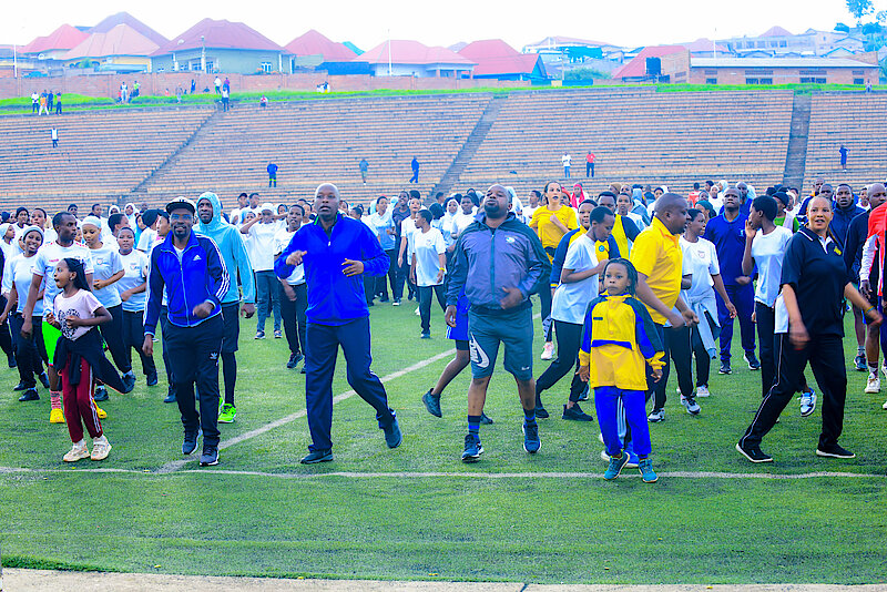 Abayitabiriye baturutse mu bice bitandukanye by'Umujyi bahurira kuri Stade ya Muhanga bakora imyitozo ngororamubiri.