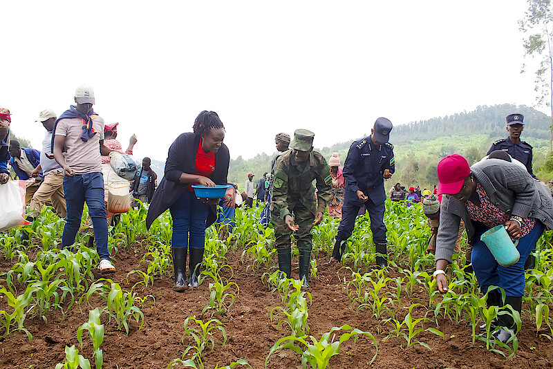 Ku itariki ya 06 Ugushyingo 2023, Guverineri w’Intara y’Amajyepfo Madamu Alice KAYITESI ari kumwe n'ubuyobozi w'Akarere n'inzego z'umutekano bifatanyije n'abahinzi bo muri Koperative IABM mu gikorwa cyo kubagara no gutera ifumbire mu bigori bihinze ku butaka buhuje bungana na hegitari 90. Ifumbire mvaruganda yo mu bwoko bwa DAP yatewe mu bigori yatanzwe na Leta yunganiwe 100% mu rwego rwo gufasha abahinzi kuzamura umusaruro muri iki gihembwe cy'ihinga cya 2024A.