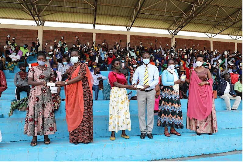 Umuyobozi w’Akarere Madamu KAYITARE Jacqueline ashyikiriza umuturage Telefoni